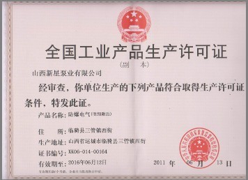 山西新星泵業(yè)有限公司防爆電氣生產(chǎn)許可證已換發(fā)。